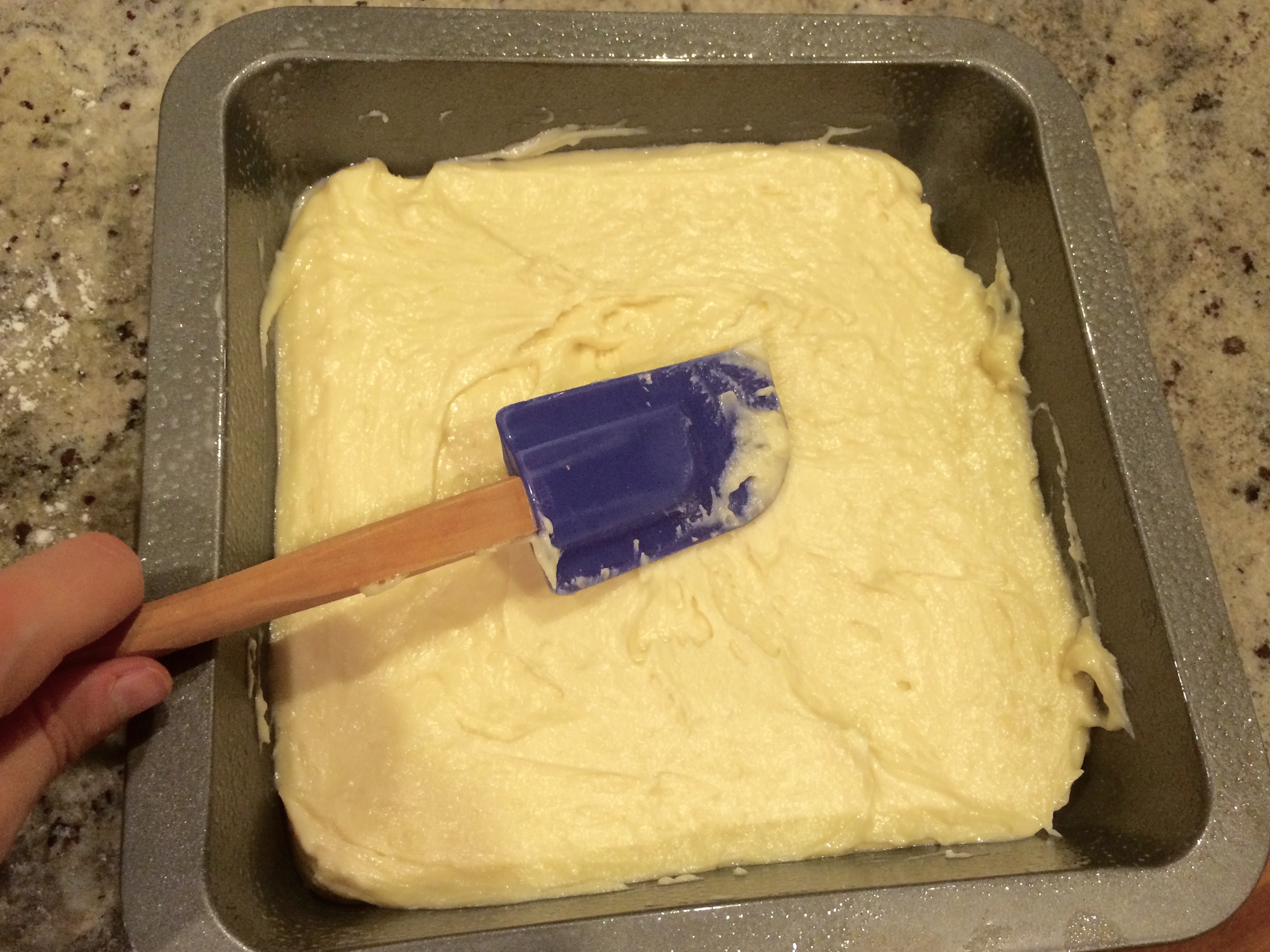 The verdict: A nice, delicate crumb; a pretty yellow interior; a sturdy, nicely browned crust, which we can probably attribute to the baking powder/soda combo. It’s certainly sweet, but not nearly as sweet as I thought it’d be, given the massive amount of sugar it’s slathered with — though that might be because a good amount of the sweet stuff slid off when I was transporting the cake from my kitchen to its final destination (someone else’s kitchen).