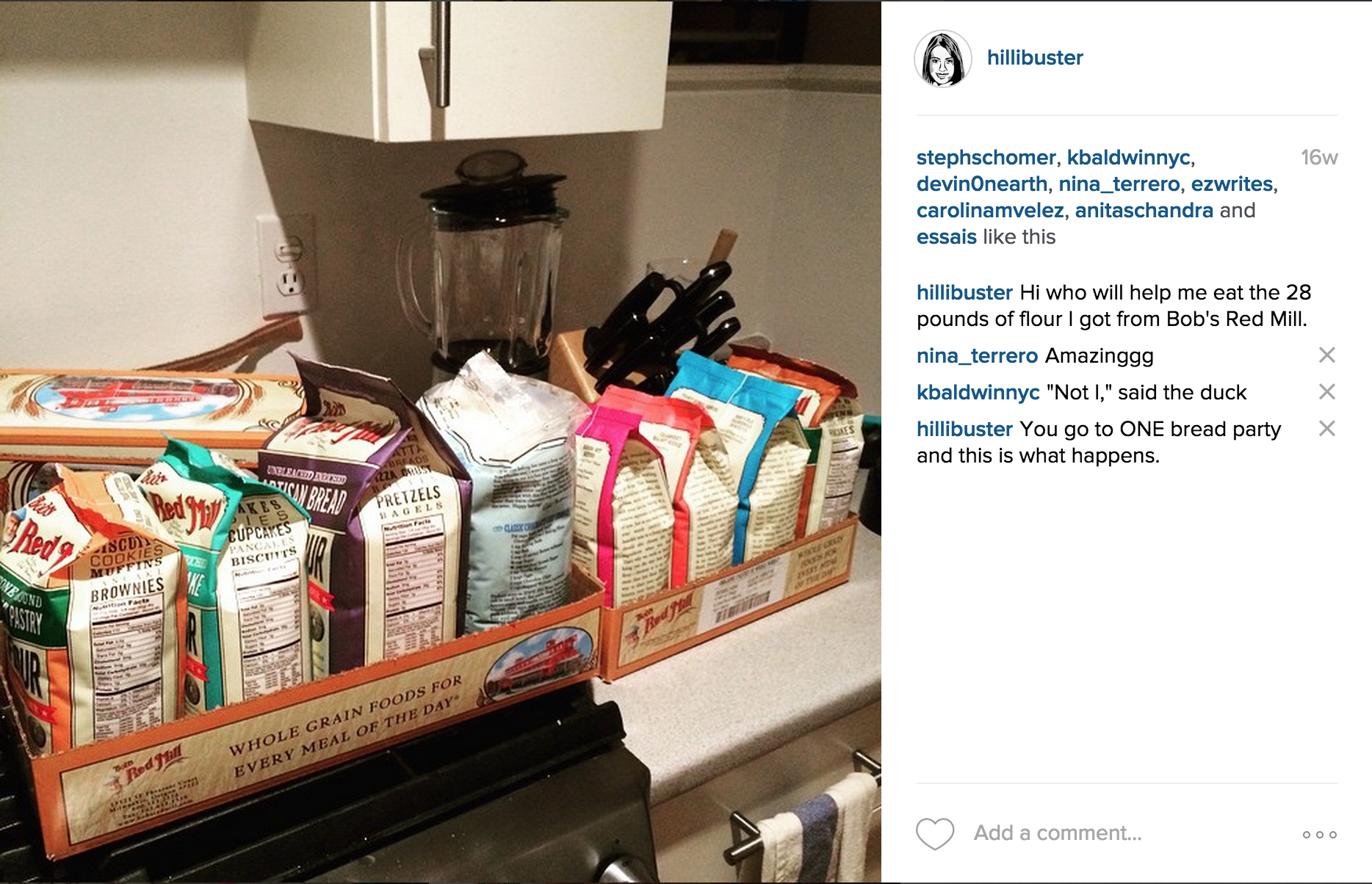 And then, a week or so later, I came home to discover that Bob’s had sent me 28 pounds of flour — full-sized bags of every variety we’d sampled at the party.