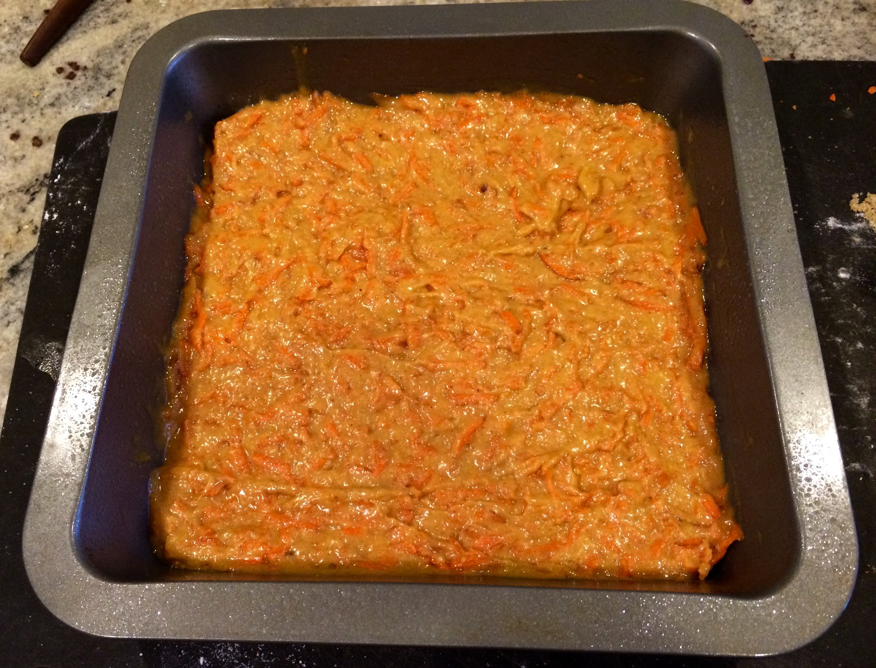 Cream butter and sugar. Add eggs and mix well. Sift flour with other dry ingredients. Add dry ingredients and grated carrots to egg mixture. Mix well. Pour into greased 9″ square baking pan and bake in 350 oven for 45 minutes, or until it tests done. [Which, for me, was more like 35 minutes in. Underbaking even more might yield something closer to pudding.]