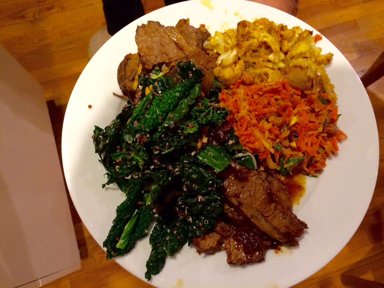 You can add sliced carrots and small potatoes to meat about an hour before serving. [You can… but I didn’t, because I planned a Hanukkah spread that already included a carrot salad and latkes, and there’s a limit to how many potatoes and carrots one menu can feature. Even a Jewish menu.] Remove meat from pot and allow to cool while vegetables are cooking. [Wait, what? I guess she figures they’ll need more than an hour in the oven.]