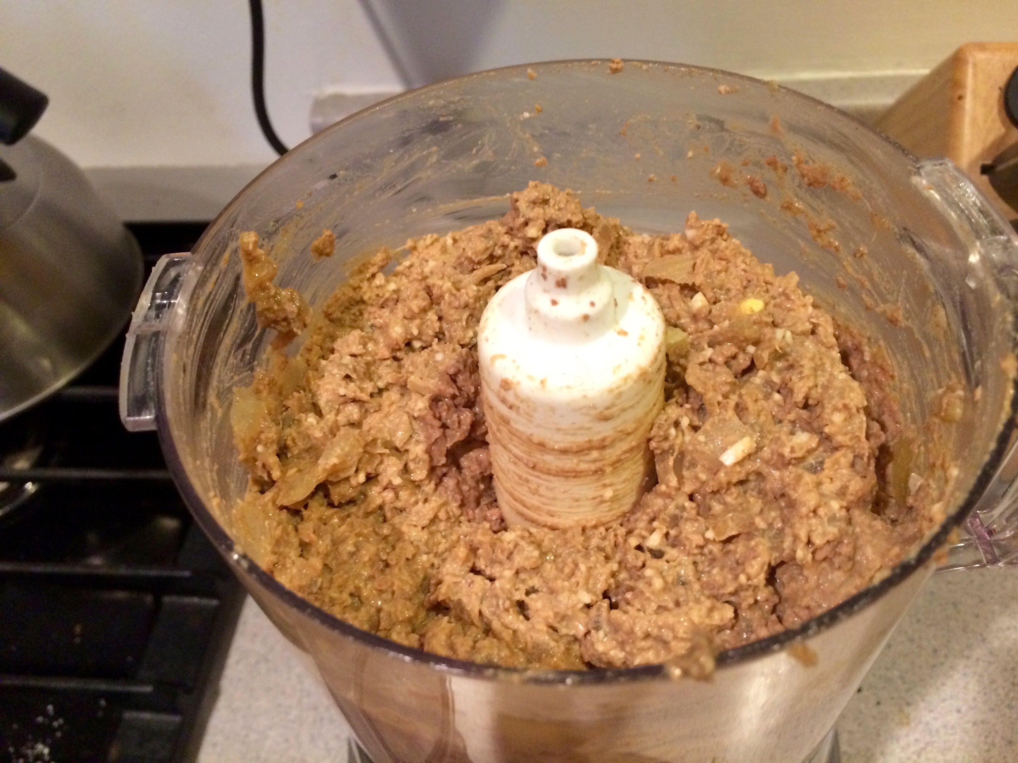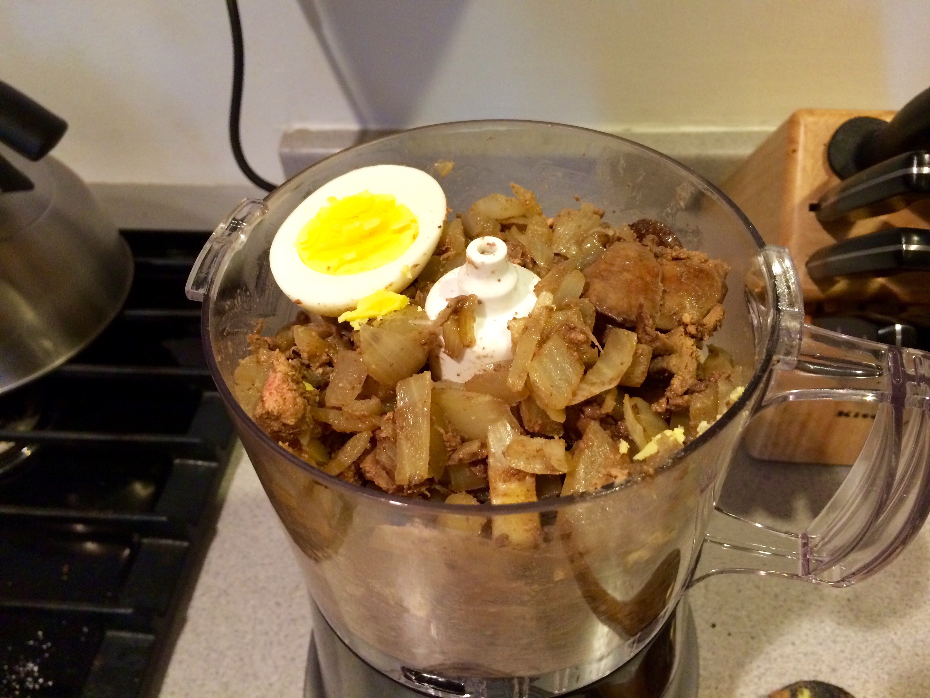 Remove from heat and turn into a wooden bowl. Add eggs and chop all ingredients together until you arrive at the consistency you desire. [Psst, Nonnie: How do you expect us to chop things inside of a bowl? Instead, I dumped the liver and onions onto a cutting board, let it cool, then transferred it to the food processor, knowing that my “desired consistency” would be a whole lot finer than anything I could produce by knife alone.]