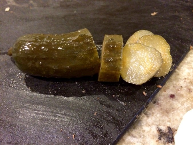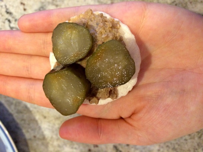 I’m not totally sure why Nonnie advises leaving out salt until right before you serve the pâté — other recipes don’t carry the same warning. I can say, though, that I enjoyed the liver a lot more with a sprinkling of fleur de sel — and even better when topped with slices of sour pickle, a la Russ and Daughters’ famous Oy Vey Schmear sandwich. (Which, granted, I haven’t actually tried, but my chopped liver adventure may inspire me to change that.) Their salty, garlicky sharpness cuts perfectly against the smooth liver, making for an exceedingly balanced bite.