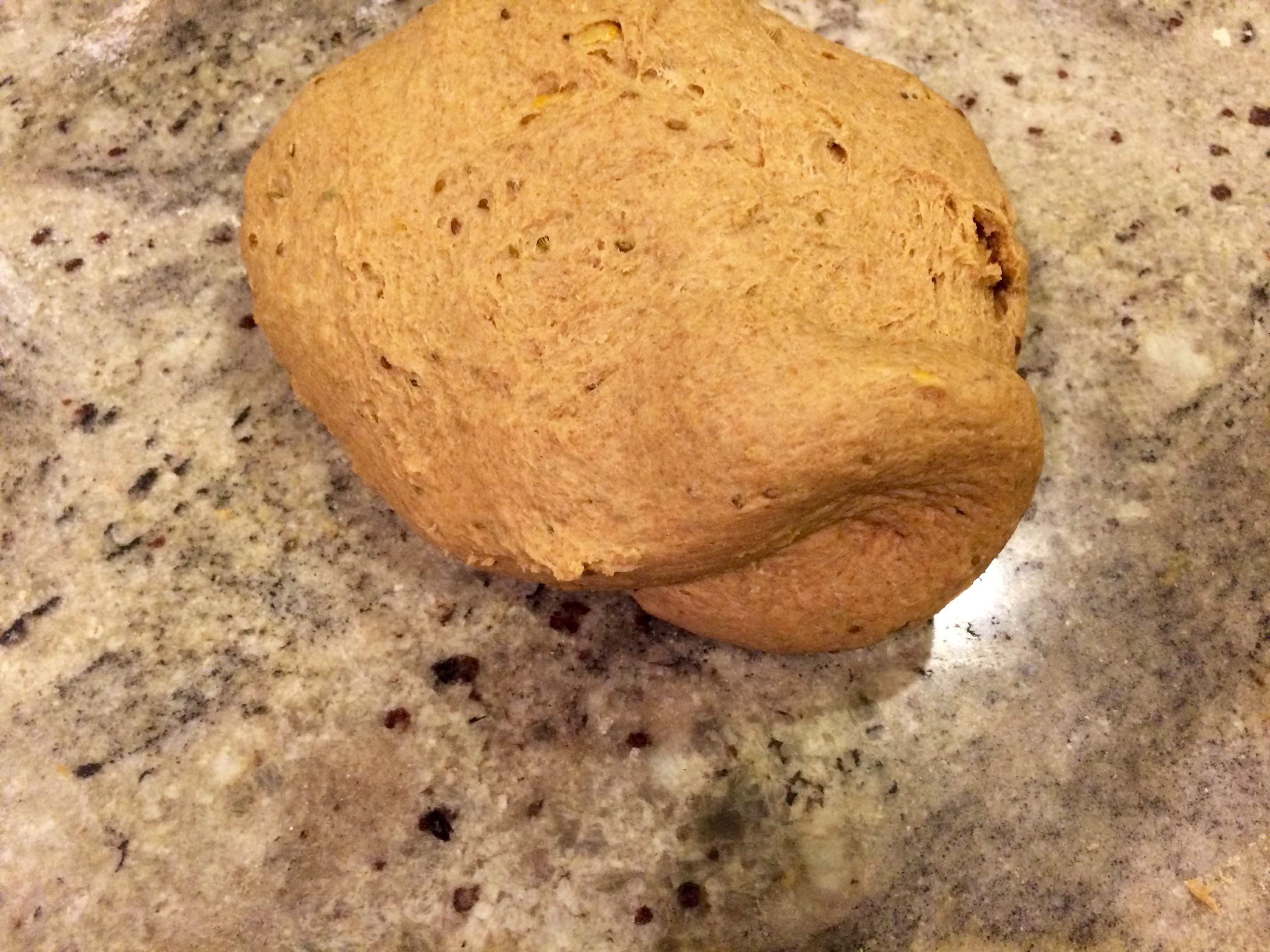 Add remaining flours, and knead about 10 minutes until smooth. [Warning: All the flour in this recipe is whole-grain, which is nice from a health standpoint — but also makes the dough fairly sticky and difficult to work with. Dusting your work surface with all-purpose flour and adding a tablespoon of it to the dough here and there will help the kneading process and better allow you to wrangle the dough into submission.]