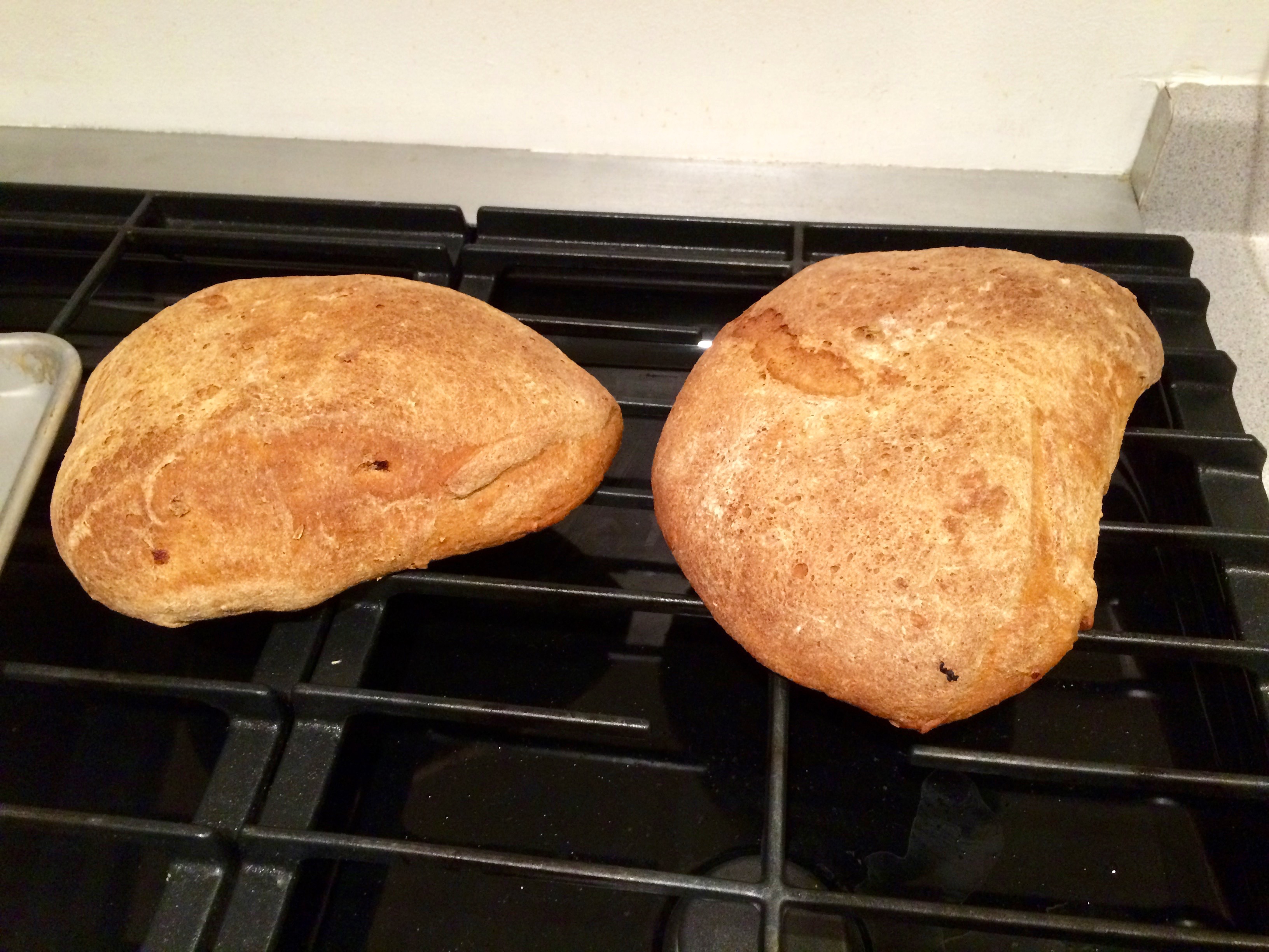 Let dough rise in a covered bowl until double in bulk. Divide into two balls and shape into cones about 4 inches high. [I wasn’t totally sure what Nonnie had in mind with this direction — how do you turn a lump of dough into a cone? — so I ended up just sort of shaping my dough into balls and letting them spread the way they felt like spreading. My mom thinks the result looked “misshapen;” I prefer “rustic.”]