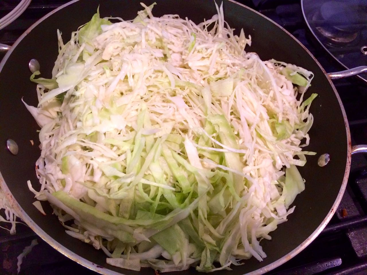 Shred cabbage and wash well. Sauté onion in 1 tablespoon butter until tender. Add cabbage to onions, cover, and steam for 2-3 minutes. [It may be tough to fit everything into one skillet, but the cabbage will wilt and reduce in volume slightly as it cooks — just stir up from the bottom every now and then to make sure it’s steaming evenly.]