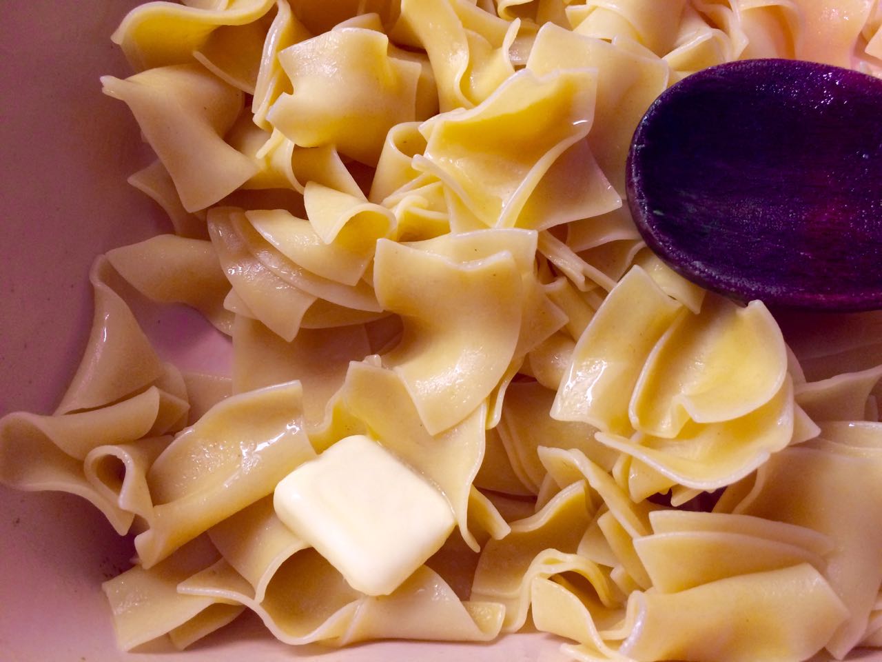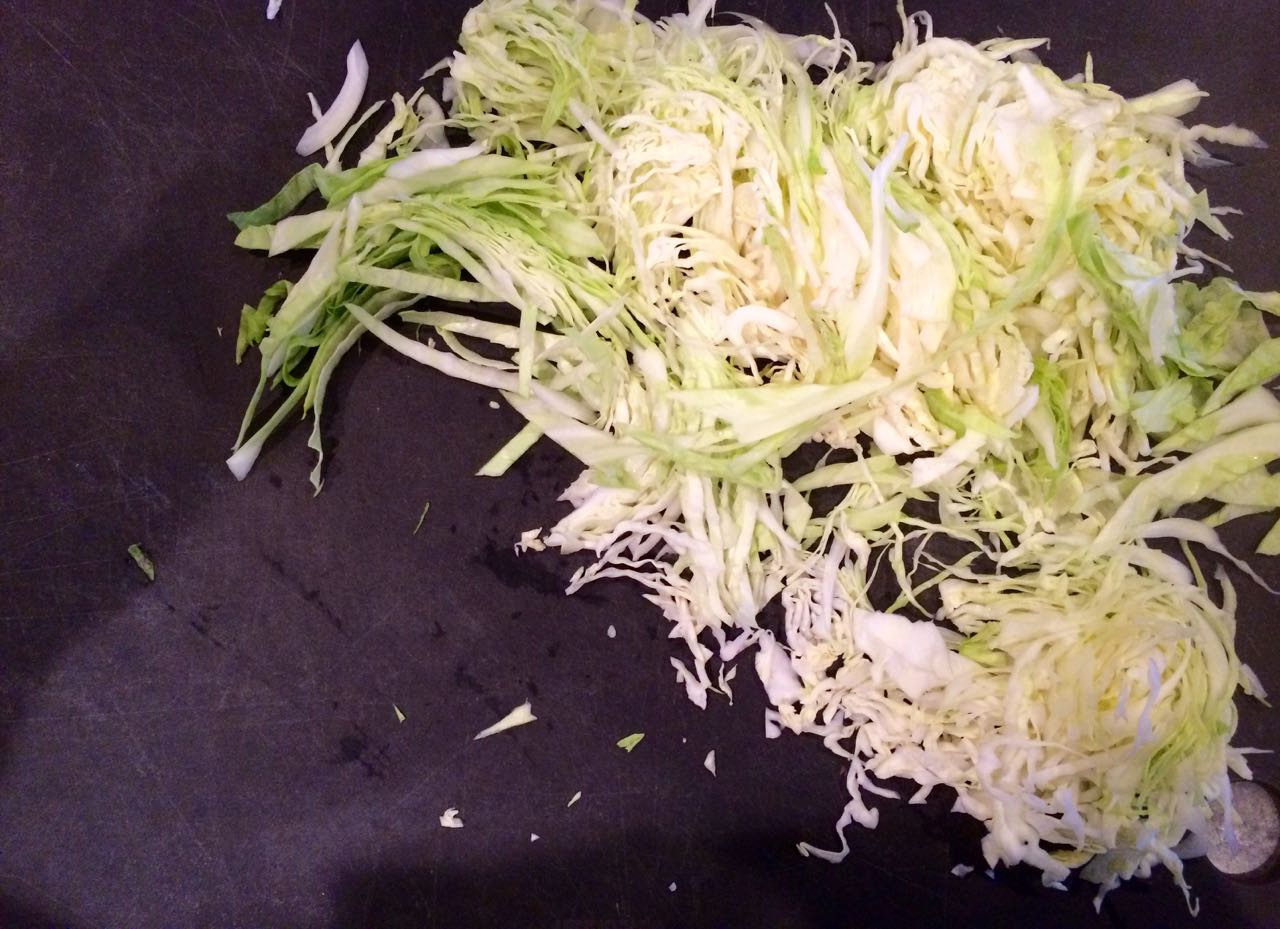 1/2 lb. medium noodles [I used wide egg noodles, which came in a 12 oz. package, which means I’ve now got 1/3 of a package of noodles chilling in my cupboard; you might as well just dump in the whole package instead, and maybe get a slightly larger head of cabbage to compensate]