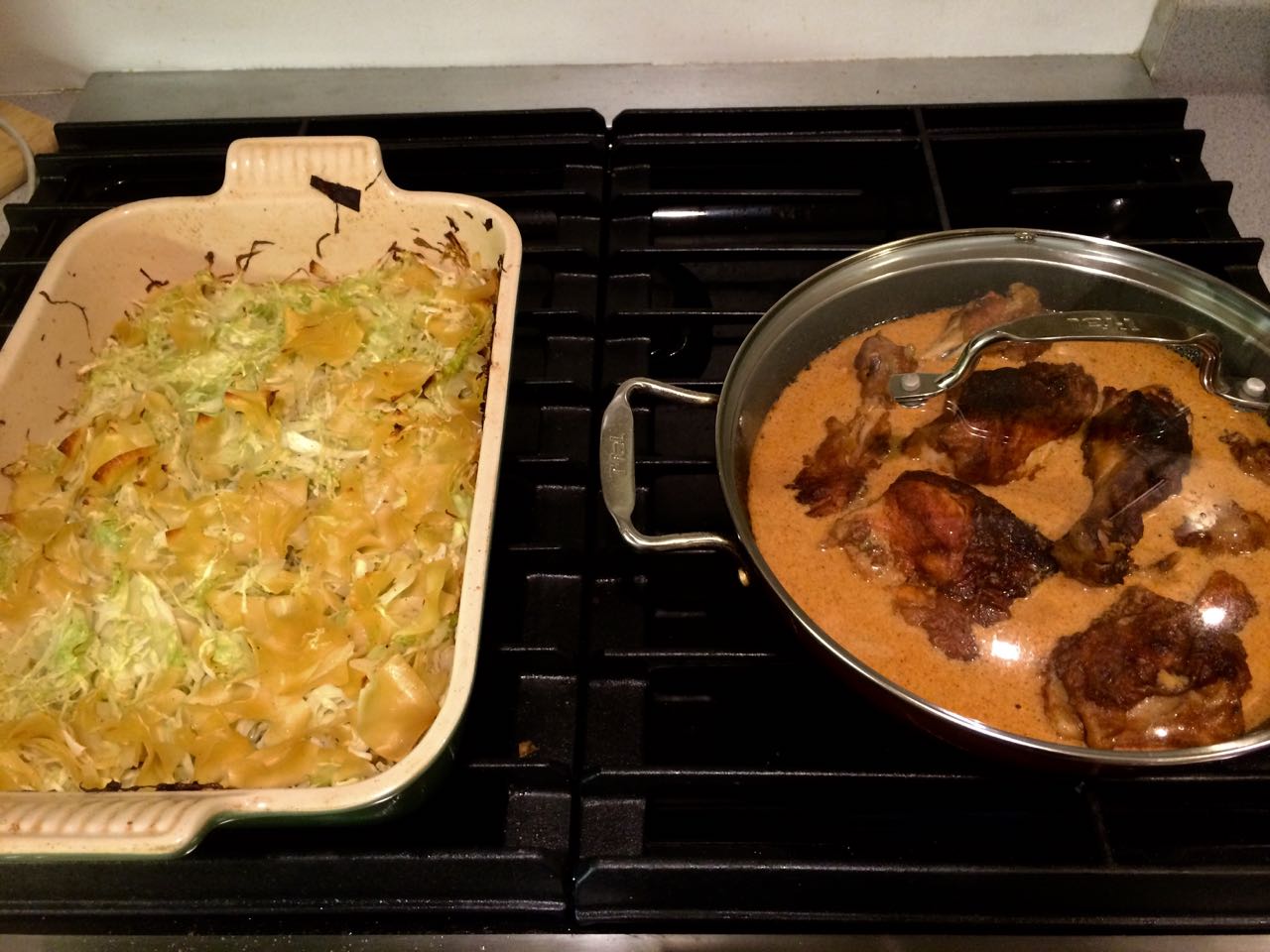 Return chicken to pan, cover, and cook over low heat until tender, about 45 minutes. Cool. Stir in sour cream. Return to heat and stir and cook over low heat until heated through. Serves 3-4. [We got more like 5.5 servings out of it, when paired with the casserole; maybe chickens these days are just bigger than the ones Nonnie was working with.]