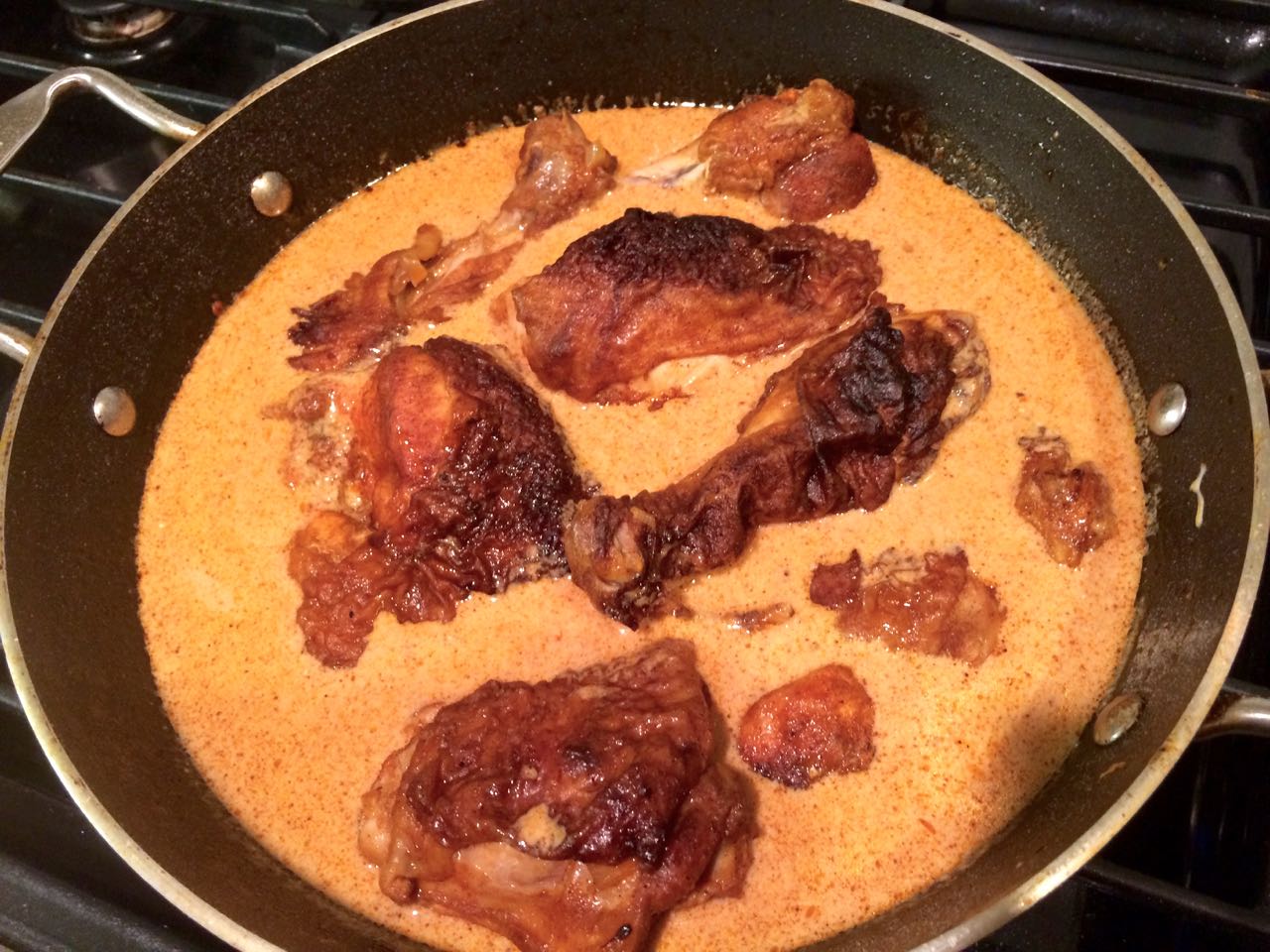 Maybe this is partially the fault of the dish’s finishing element — a full cup of straight-up sour cream, which softens the paprika’s bite. It’s also a function of Nonnie’s particular recipe, which coats raw chicken with a mixture of flour and paprika but doesn’t incorporate additional paprika into the sauce.