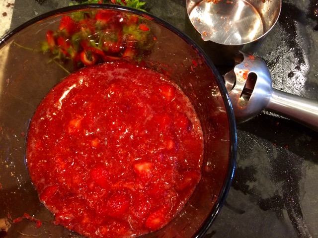 Wash and hull strawberries. Set aside large strawberries. Make 2 cups pulp in blender or processor [or by using an immersion blender, if you’ve got one; it’s much less messy].