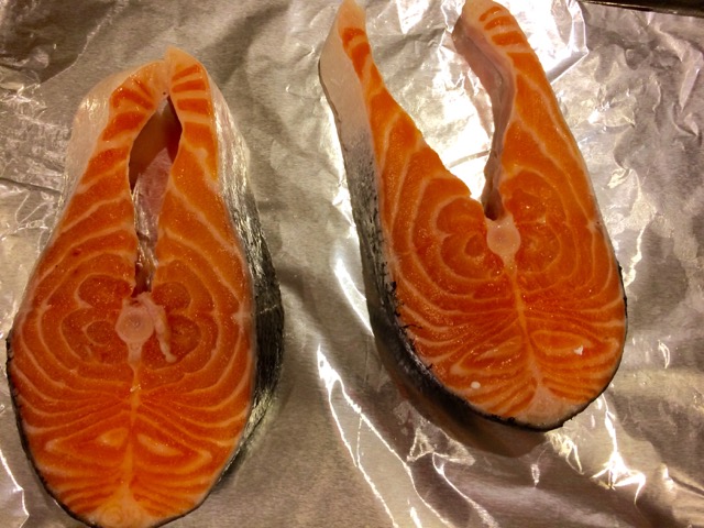 Salmon steaks, 3/4-1″ thick [I used two, and they came out to be around .7 pounds each—more than enough for two people, probably fine for four as long as you’ve got sides]
