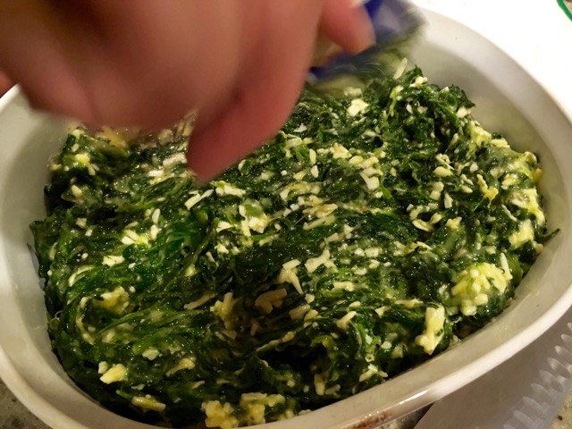 Cook spinach and drain well. [We—who am I kidding, my mom—used the microwave, nuking each package individually before letting the contents cool, then wringing until her Moo-ey little hands could wring no more. It’s sort of like the latke-making process, which, by the way, is about a bazillion times easier once you get a fancy food processor. Again: Get married for the gifts!]