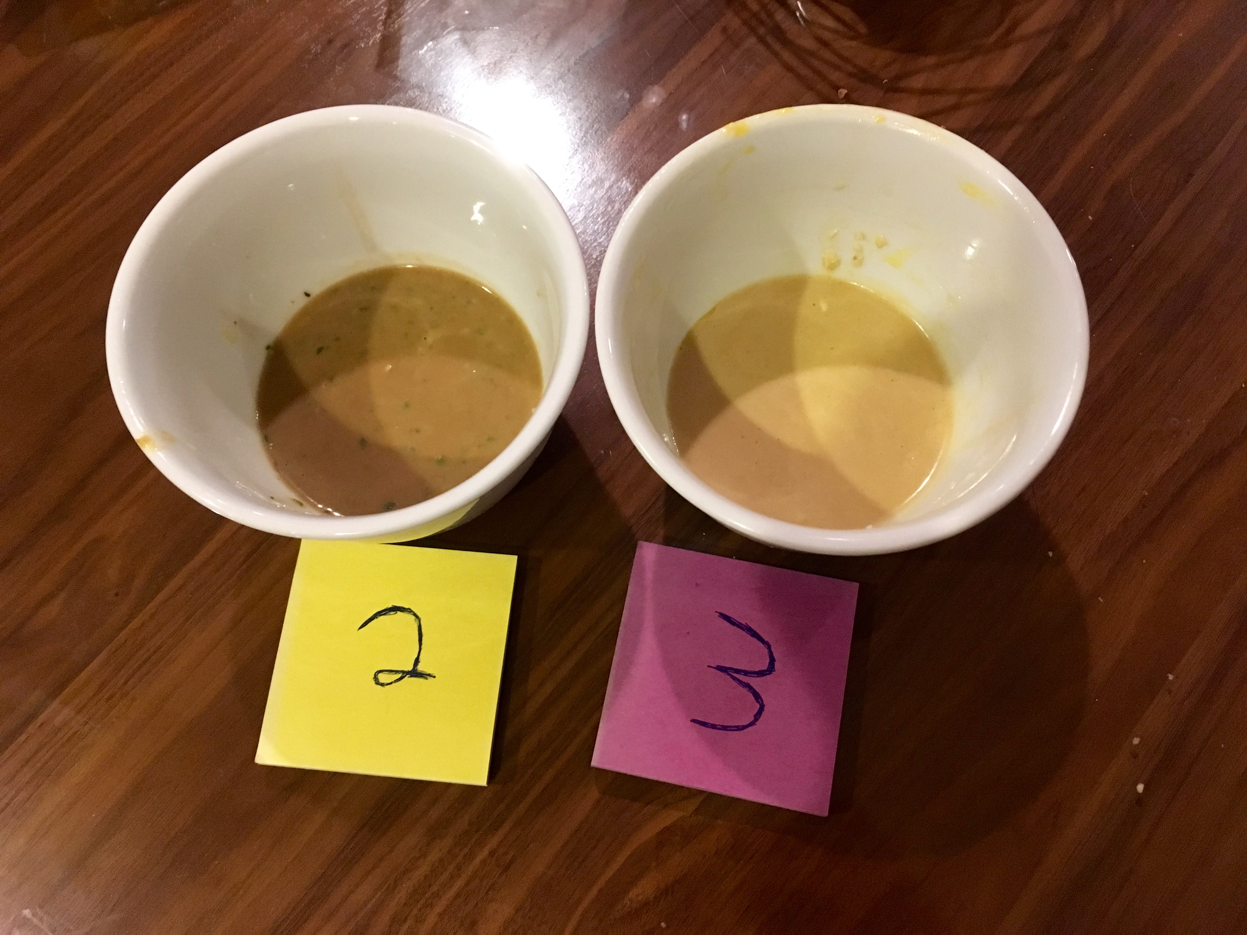 The verdict: Dressing no. 1—labeled, confusingly, no. 2 in the photos above, because I was literally too lazy to tear off a Post-It and write the number “one” instead—was thick, tart, and rich, with a solid anchovy bite.