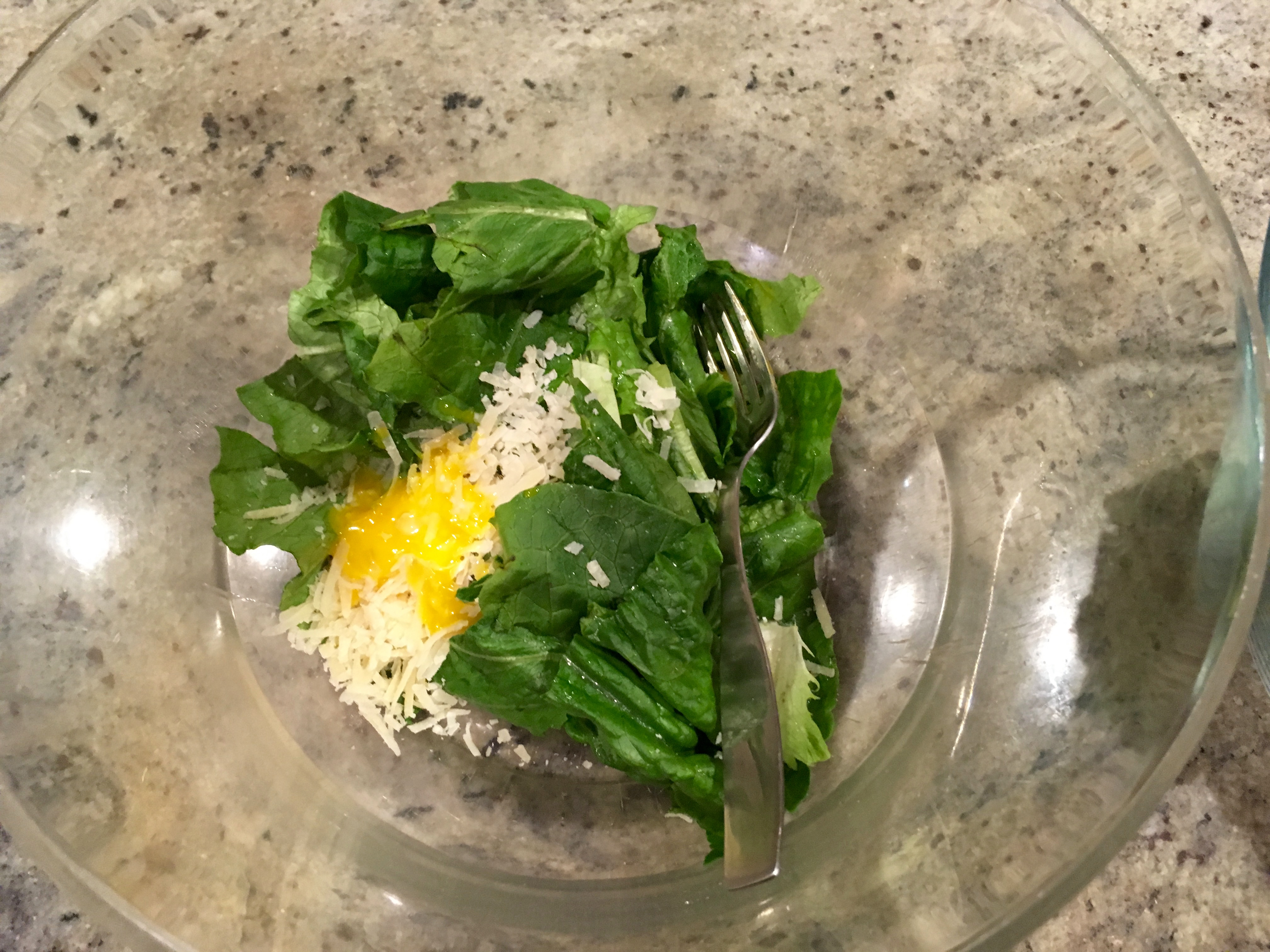 Mix yolk and romaine well. [This is a weird step—why in the world does Nonnie not just have you mix the egg with the rest of the dressing, rather than separately with the romaine? Maybe because she’s trying to emulate the original Caesar, which was tossed tableside like the guac at Rosa Mexicano?] Sprinkle 1/3 cup grated Parmesan cheese over salad, add some croutons, pour dressing over, and mix well.