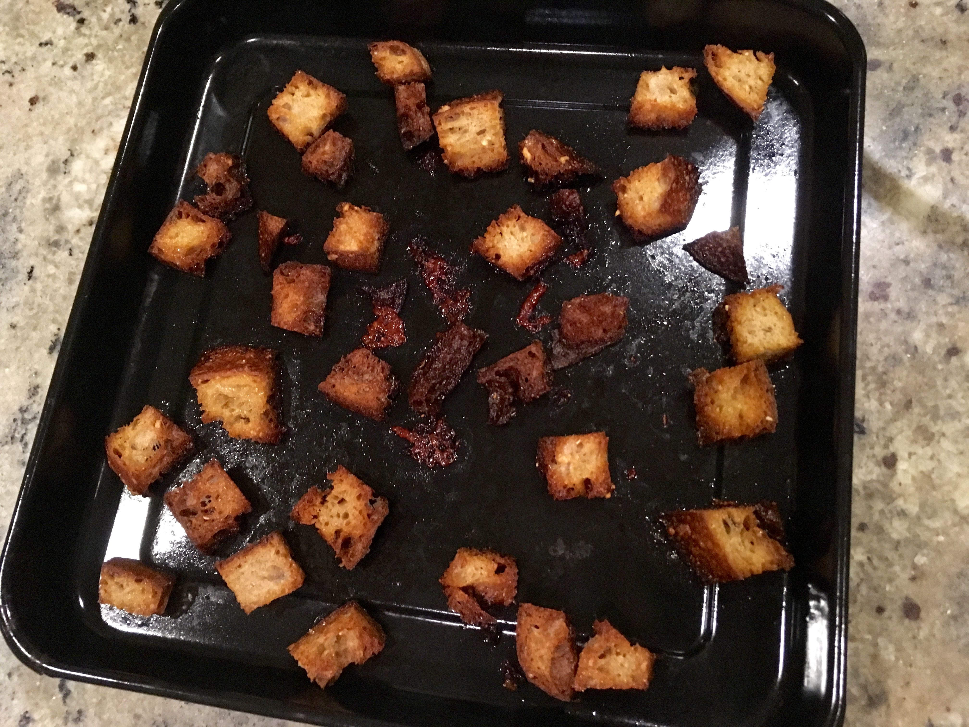 [Add some croutons, eh? I didn’t have any pre-made ones lying around, so I made the easiest croutons ever out of some cubed bread tossed with olive oil; I put them in the toaster oven and promptly forgot about them, which is why they ended up so dark. Let’s call them “crispy” instead of “slightly burnt,” okay?]