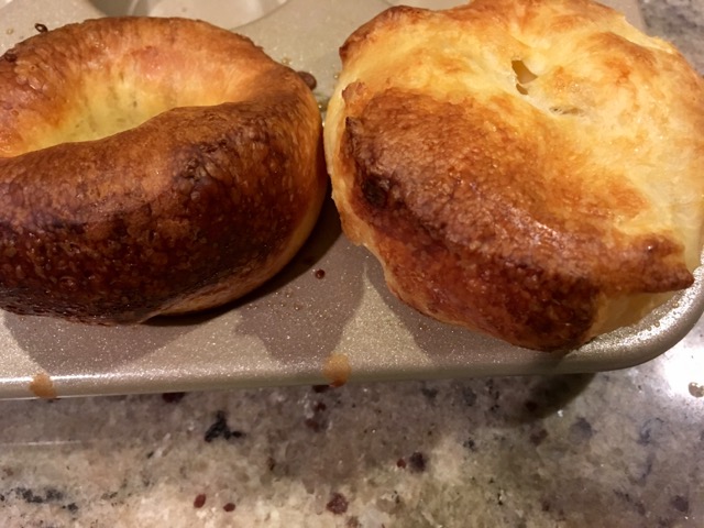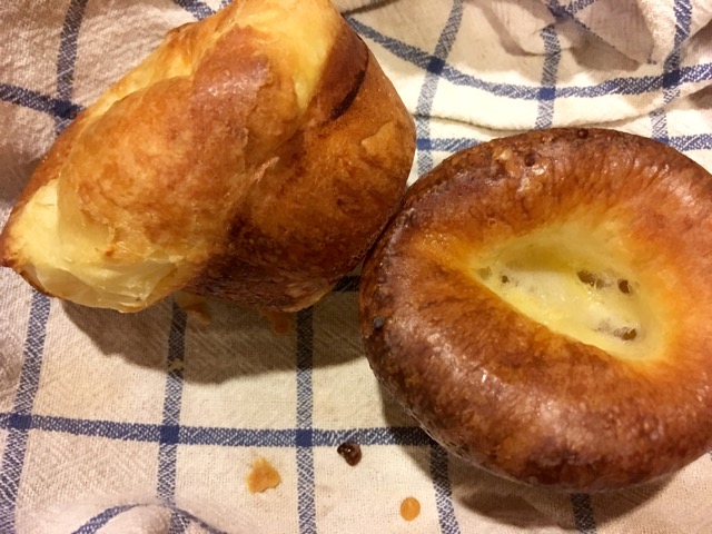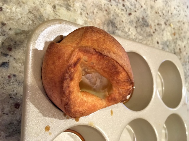 Serve hot. Makes 6-8 popovers. [The yield count is accurate; I doubled the recipe and ended up with 15 or 16 altogether.]
