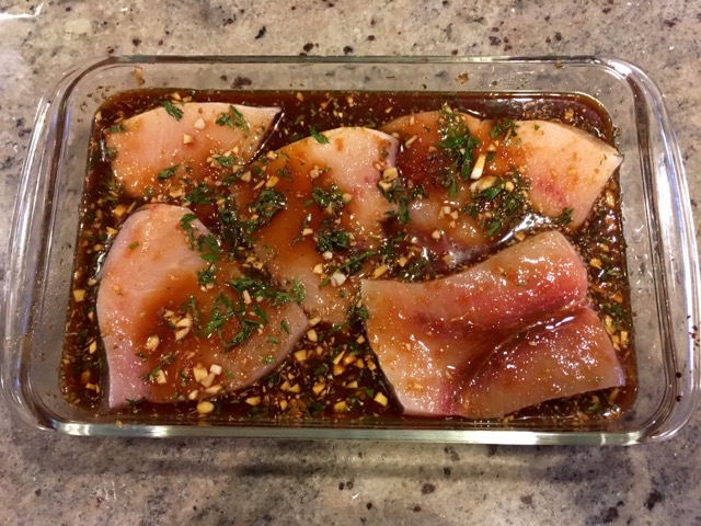 Place fish in a shallow baking dish. Combine all other ingredients in a small bowl, mix well, and pour over fish. Marinate for at least 2 hours. Broil fish and baste [or “bast,” as Nonnie so charmingly puts it] with marinade several times while broiling. [I cooked mine for about five minutes total per side, which was enough to cook it all the way through without drying it out; you could probably go even less if you wanted a rarer piece of fish. I also put it on a rack in the pan in an attempt to get good color on both sides, although I’m not sure how much of a difference that ultimately made.]