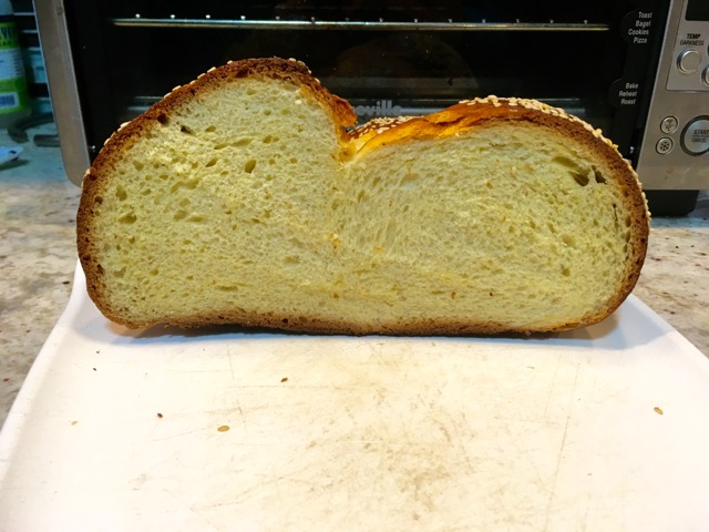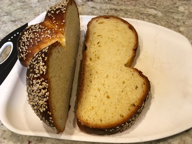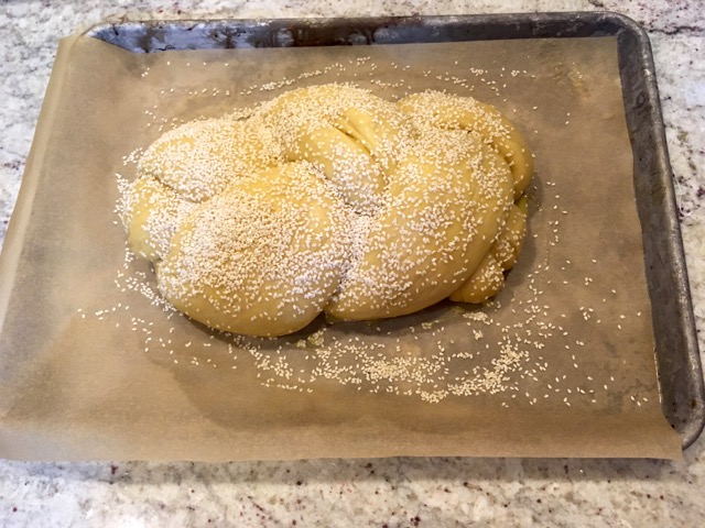 Heat oven to 375. Beat remaining egg with a splash of water and brush over challah. (If you want an extra-extra bronzed crust, you can brush the egg wash onto the challah before its last rise, then re-egg-wash it one more time before you put it into the oven.) Sprinkle on sesame seeds, if you feel like it. Bake challah for 30-40 minutes, and cool on rack before serving.