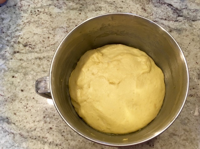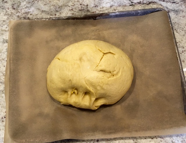Transfer dough to counter—it won’t stick if you work quickly; this is not a sticky dough—oil your mixing bowl, place dough back into bowl, and cover with plastic wrap to let it rise for 1-2 hours, or until almost doubled in size. If your kitchen is cold enough to impede rising, place the bowl in an oven that has been heated to 200, then turned off; if you’re doing an in-oven rise, cover it with a dish towel instead of plastic wrap.