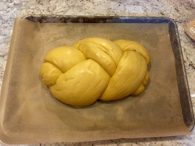 Dump dough onto a baking sheet covered in parchment paper and divide into as many equal pieces as you need to make the braid of your choice—a regular three-rope braid, as I did, or something fancier, if you are so inclined. Cover with a dish towel or plastic wrap and let rise for another 45 minutes to one hour, or finish this final rise in the fridge overnight. (Taste-wise, both methods yield similar results—this isn’t sourdough, which becomes more deeply flavored when it rises slowly in a cold environment.)