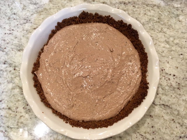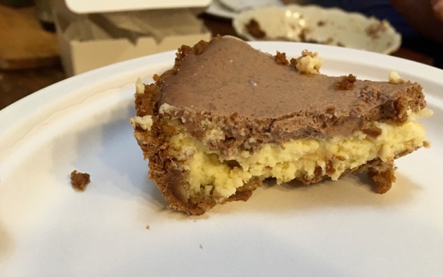 Basically, what you have here is a graham cracker crust filled with cheesecake filling, then topped with a sort of homemade chocolate Cool-Whip situation and refrigerated until firm. It’s not exactly cosmopolitan, but even your schmanciest friends won’t care about that when they’re shoving it into their own pie-holes; trashy but scratch-made Betty Crocker-esque desserts may just be the great equalizer.