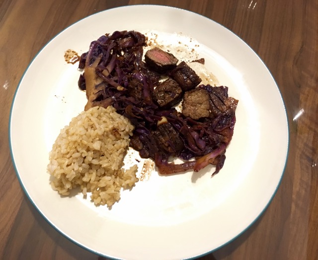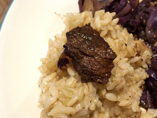 The verdict: Again: it was fine! The flavor was more sweet soy than a real teriyaki; if I made this again, I’d reserve some of the marinade and use it to make a sauce. I don’t think it would have turned out all that differently if I’d actually had strips of beef instead of cubes, but then again, who knows; more surface area on each piece would have at least meant more charred and crispy ends, which everyone knows is usually the best part of a steak.