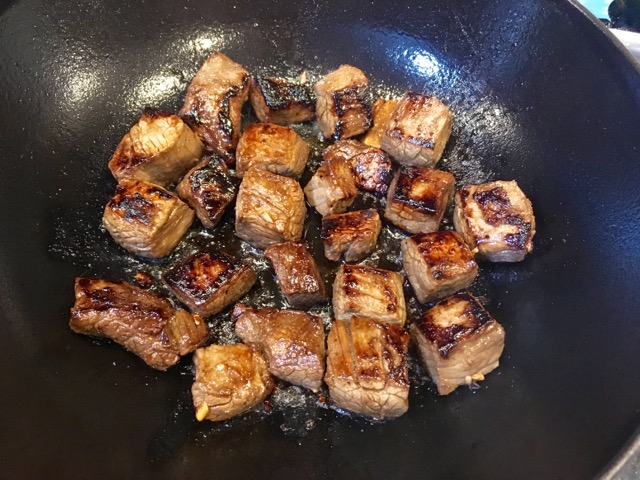 Cook over high heat, quickly, in skillet or barbecue, or cook in wok. [I used a wok—I browned my cubes on all sides and then cut inside, and was pleased to find that most of them still had a bit of pink at the center. That’s one benefit of cubes over strips, I guess; you’re less likely to overcook thicker pieces of beef.]